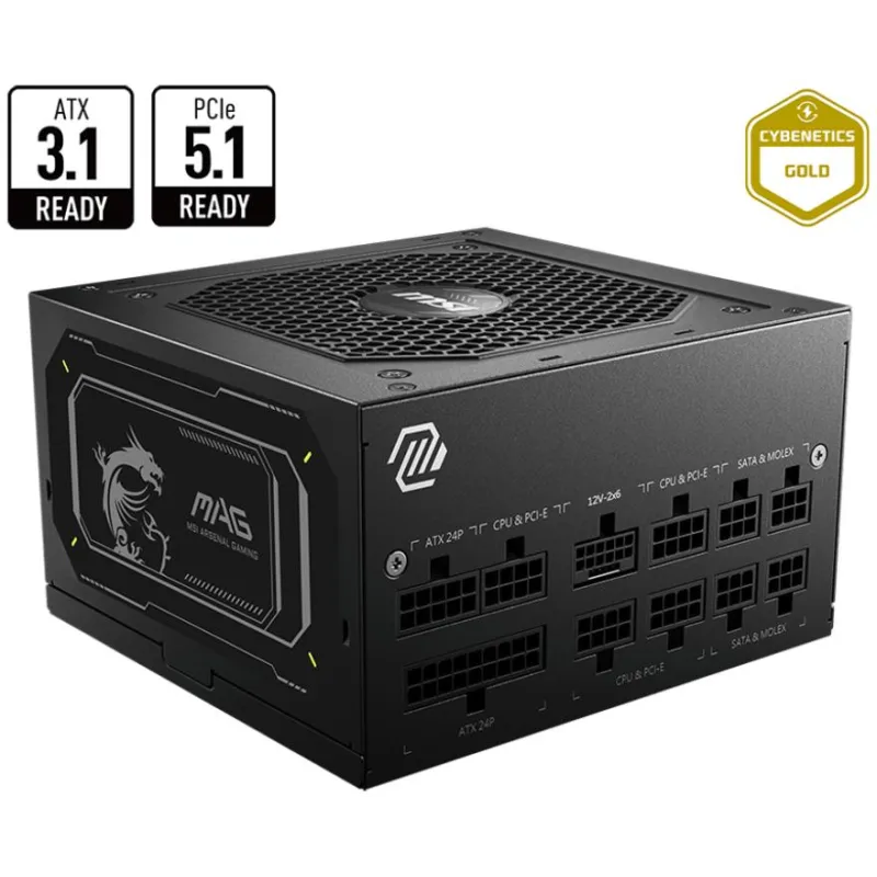 Fuente de Alimentación MSI MAG A750GL PCIE5 II con certificación 80 PLUS Gold, potencia total 750 W , cableado totalmente modular y formato ATX 3.1