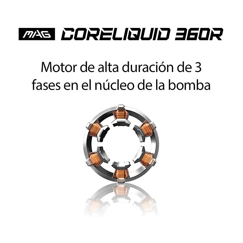 La refrigeración MAG CORELIQUID 360R posee un sistema de iluminación LED ARGB direccionable en el depósito y ventiladores, lo que permite personalizar su iluminación y sincronizar sus colores con los de tu equipo. El bloque de la bomba es rotativo hasta 270 grados y cuenta con una base de cobre para una alta conductividad.