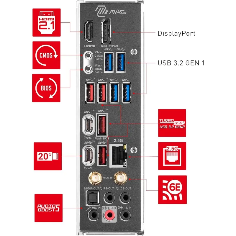 Esta motherboard gaming ATX incorpora una amplia variedad de conexiones, incluyendo USB 3.2 Gen 2x2 Tipo C, Wi-Fi 6 y Bluetooth 5.3, proporcionando una conectividad sin interrupciones. Su chipset Intel Z790 optimiza el rendimiento del sistema, mientras que su soporte para RAID 0, 5 y 10 permite configuraciones avanzadas de almacenamiento. Además, cuenta con Ethernet 2.5G para una conexión estable y de alta velocidad.