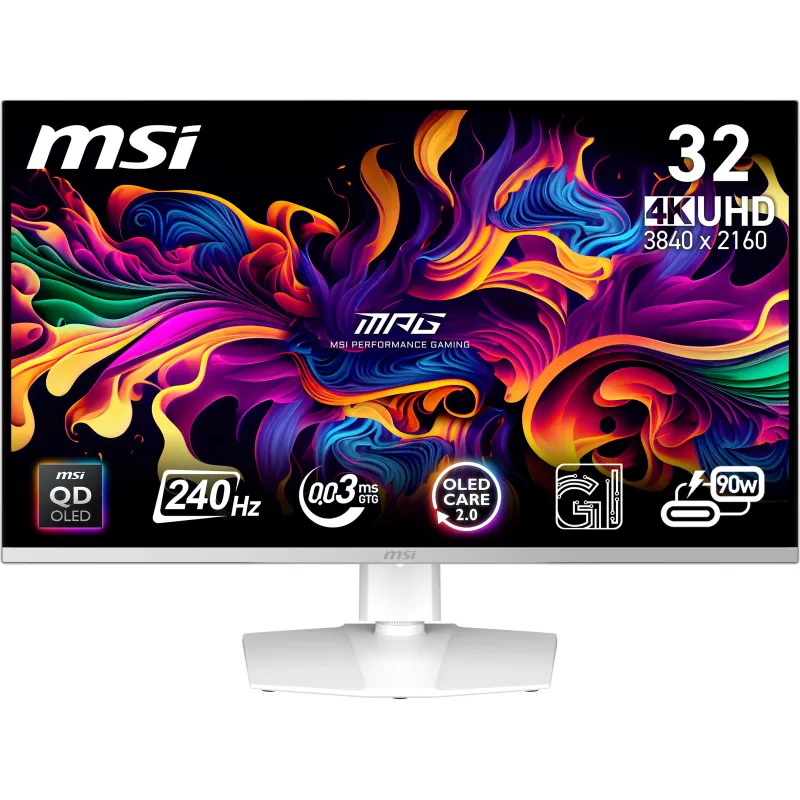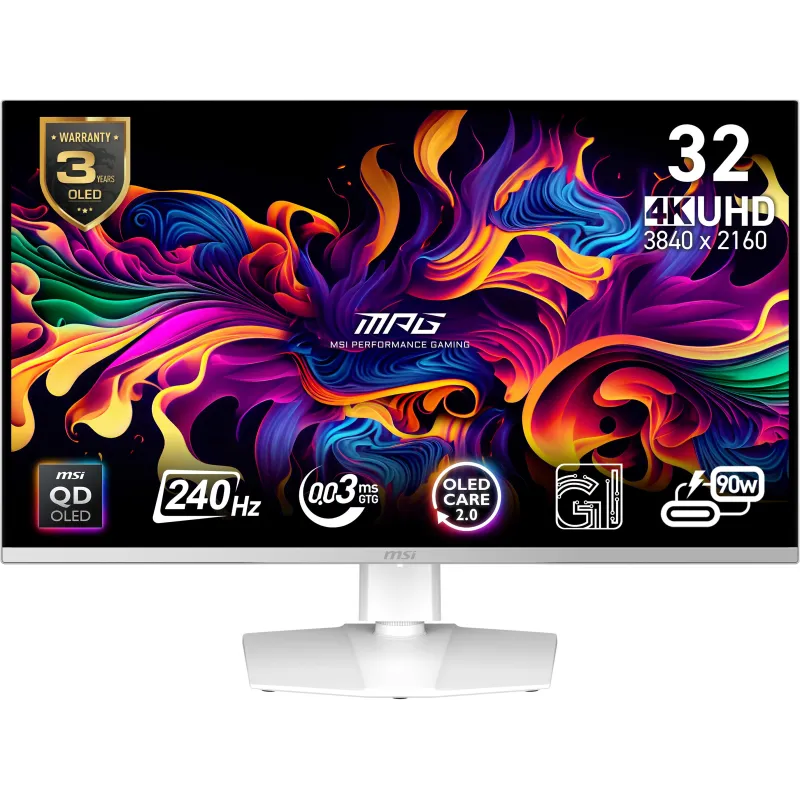 Monitor MSI MPG 321URXW QD-OLED Blanca con pantalla 4K, frecuencia de actualización de 240 Hz , HDR 400 y tecnología QD-OLED para imágenes ultra nítidas