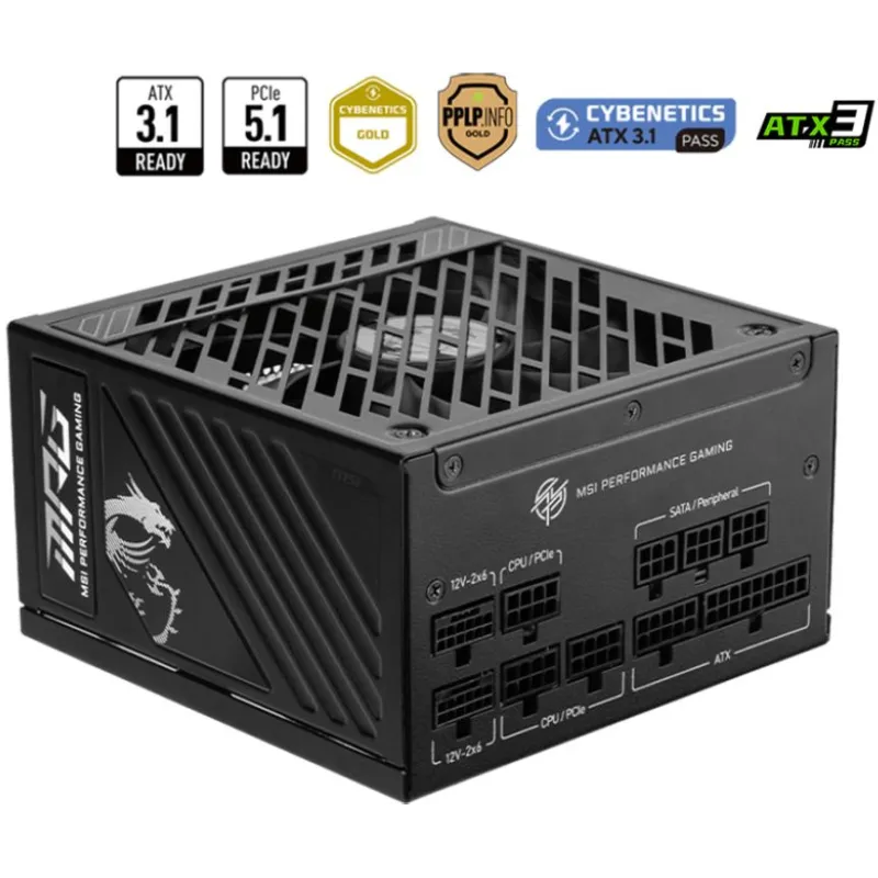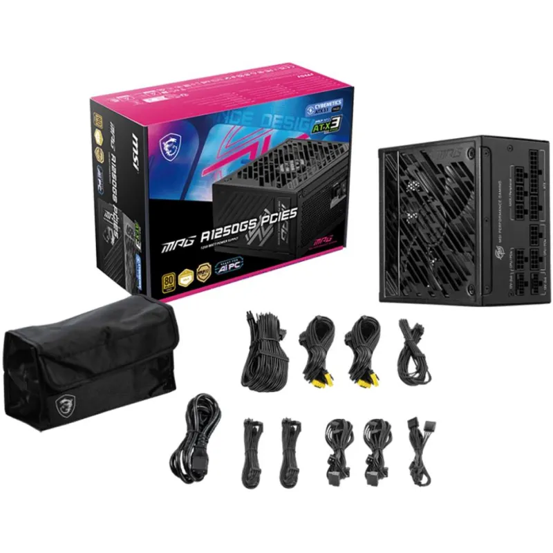 Fuente de Alimentación MSI MPG A1250GS PCIE5 con certificación 80 PLUS Gold, potencia total de 1250 W y diseño modular para equipos ATX de alto rendimiento