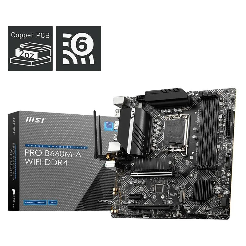 La PRO B660M-A WIFI DDR4 viene equipada con un chipset Intel B660 y un chip de sonido Realtek ALC897, ofreciendo una experiencia de audio inmersiva con 7.1 canales. Su factor de forma micro ATX es perfecto para ensamblar un PC potente y compacto, compatible con los sistemas operativos Windows 10 y Windows 11.