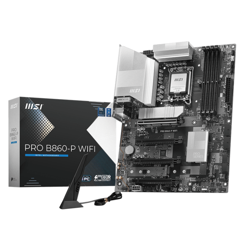 PRO B860-P WIFI: PRO B860-P WIFI ofrece un diseño sencillo con un armonioso esquema de color plateado que combina perfectamente tanto con PCs blancos como negros. Está diseñado con muchas características exclusivas de MSI, un verdadero Wi-Fi 7 con EZ Antenna, 5G LAN, Thunderbolt 4, PCIe 5.0 M.2, y Supplemental PCIe Power, listo para los procesadores Intel® Core™ Ultra.