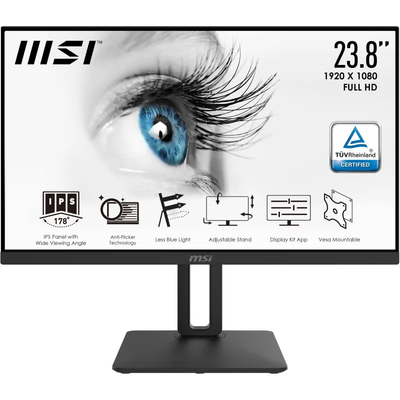 El monitor MSI PRO MP242 Protector de vista – de 23,8", Full HD, Less Blue Light, Anti-Flicker, Antireflejo, Display Kit, soporte VESA & Altavoz integrado, diseñado para el aprendizaje óptimo en casa.