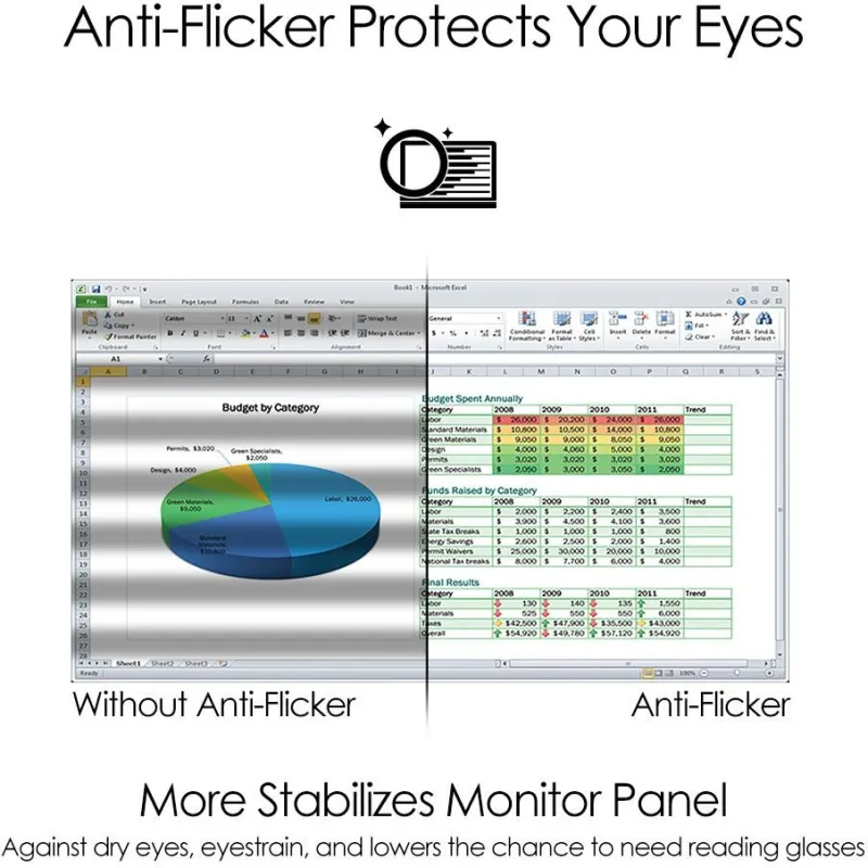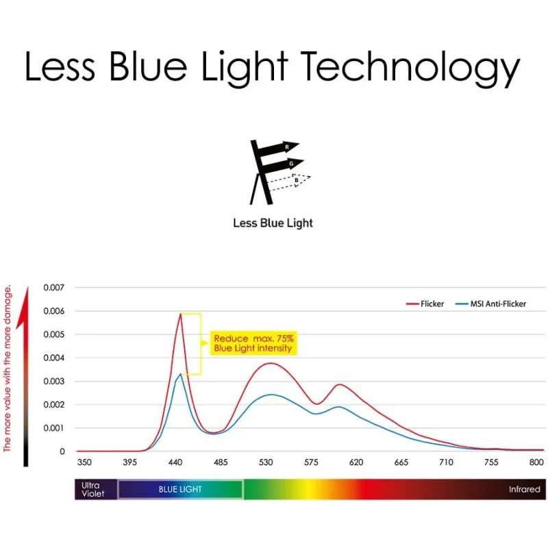 UN PANEL MÁS ESTABLE. CONTRA EL FLICKERING, LOS OJOS SECOS, LA VISTA CANSADA Y LAS GAFAS DE LECTURA: Gracias a la tecnología Anti-Flicker de MSI, se proporciona una corriente de salida estable para el monitor. Protegerá tu vista y también ayudará a evitar la sequedad y el cansancio de los ojos.