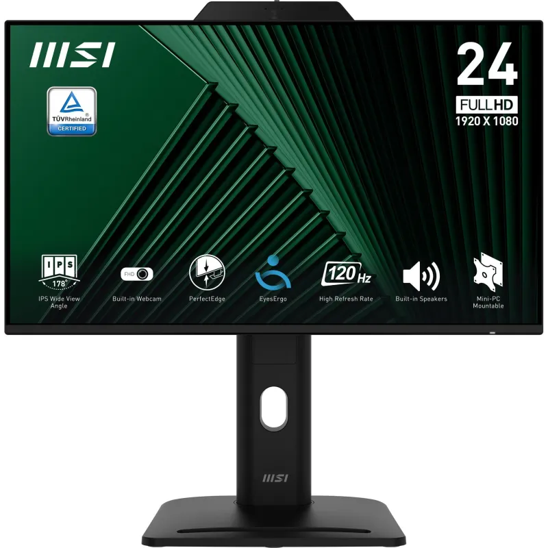 EL MONITOR DE OFICINA MSI PRO MP242PMG OFRECE: El monitor de oficina MSI PRO MP242PMG cuenta con una nítida pantalla IPS Full HD (1920 x 1080) de 23.8" con tecnología amigable para los ojos y un diseño de soporte inteligente. La cámara web integrada, el micrófono digital y los altavoces de 2x 2W ofrecen reuniones en línea fluidas y de alta calidad. El monitor ecológico está meticulosamente diseñado para cumplir con estrictos estándares ambientales, asegurando un mundo más limpio y verde.