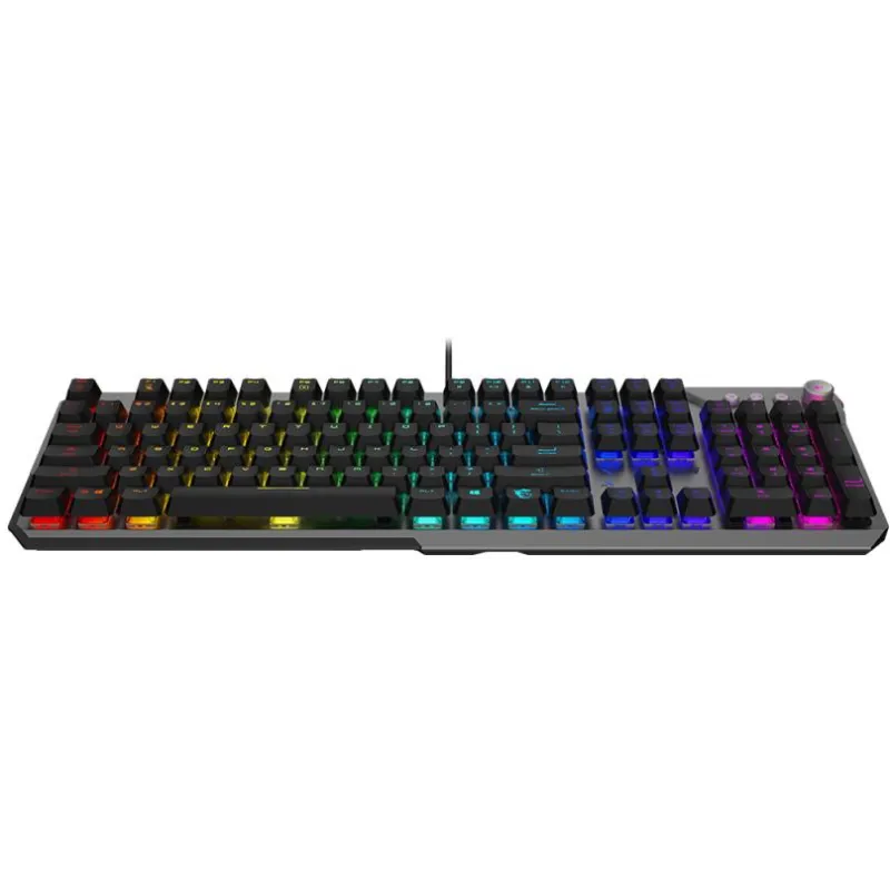 El Teclado MSI STRIKE 600 SILENT ES presenta un diseño completo (100%) con distribución QWERTY en inglés internacional, incluyendo teclado numérico y teclas de acceso rápido a funciones de Windows. Esta configuración permite una experiencia de escritura y navegación más eficiente, tanto en juegos como en tareas cotidianas. La conexión alámbrica mediante USB asegura una transmisión de datos estable y sin interrupciones, mientras que su longitud de cable de 1,8 m proporciona libertad de movimiento. Su compatibilidad con Windows 10 y 11 lo convierte en una opción versátil para usuarios actuales. El interruptor mecánico garantiza precisión y fiabilidad, mientras que la retroiluminación LED RGB añade un toque de personalización que no pasa desapercibido.
