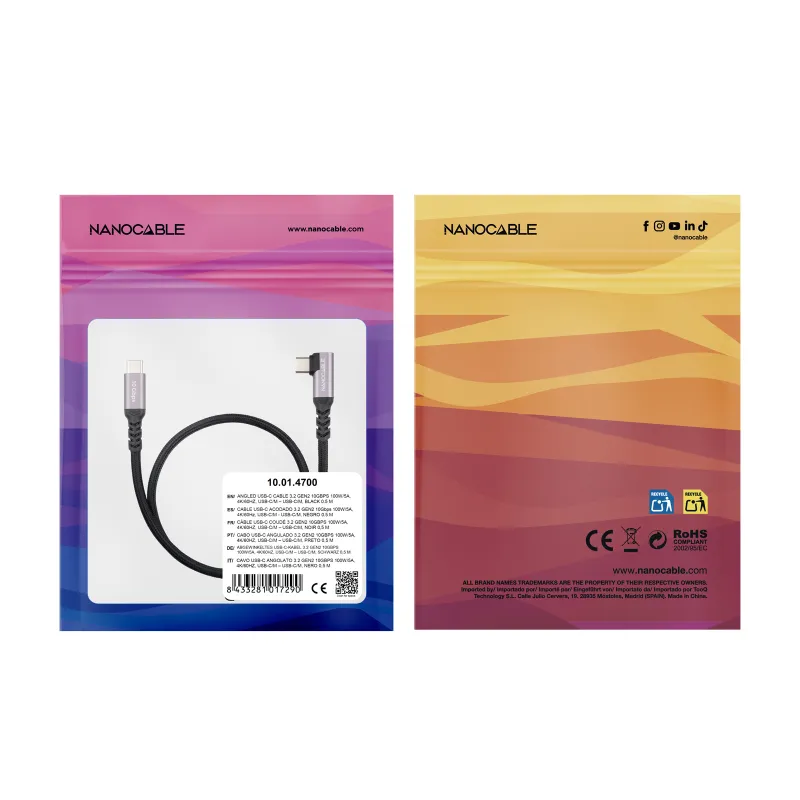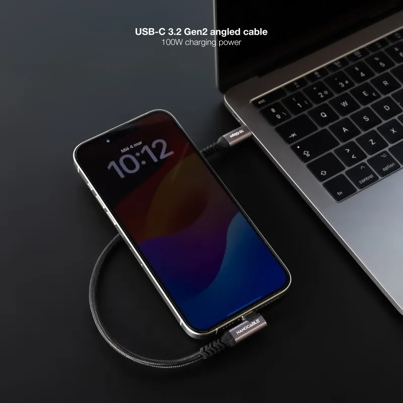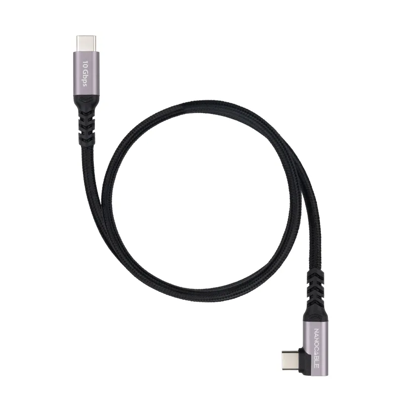 El Nanocable 10.01.4703 es un USB-C a USB-C de 3 m pensado para escritorio: te da margen real de colocación y el conector acodado ayuda cuando el cable queda lateral o el equipo se usa mientras carga.