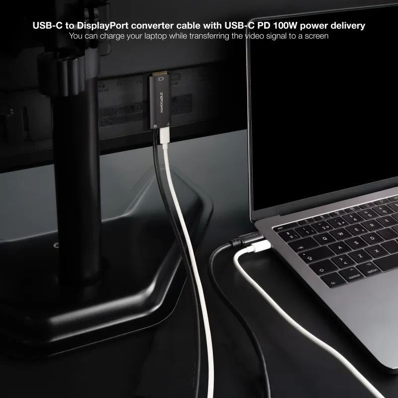 USB‑C macho para el equipo, DisplayPort macho para el monitor y un USB‑C hembra dedicado a la carga (PD).