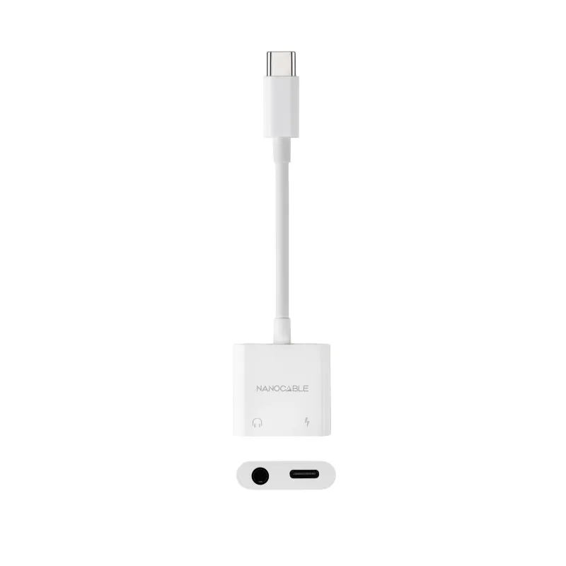 Nanocable 10.24.1206 Adaptador de Audio USB-C/M a Jack 3.5/H + USB-C/H PD 60W, 11.5 cm, Blanco