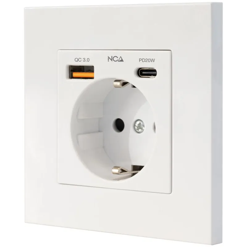 Toma Schuko CEE 7/3 Nanocable 10.35.0011 con 1×USB-A QC 3.0 y 1×USB-C PD (hasta 20 W). Salida total 5 V/3,4 A, 16 A/250 V, blanca.Schuko con USB-A QC 3.0 y USB-C PD en el mismo punto