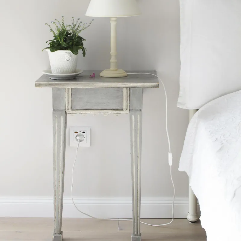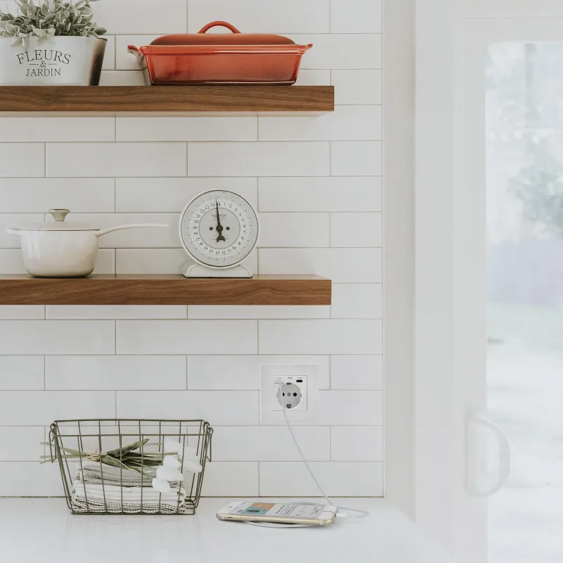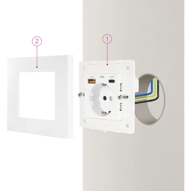 Esta toma de corriente de pared combina una base Schuko CEE 7/3 con toma de tierra y dos puertos de carga: 1×USB-A Quick Charge 3.0 y 1×USB-C Power Delivery. Está pensada para sustituir una toma de pared y ganar un punto de carga para móvil y accesorios sin ocupar el enchufe principal.