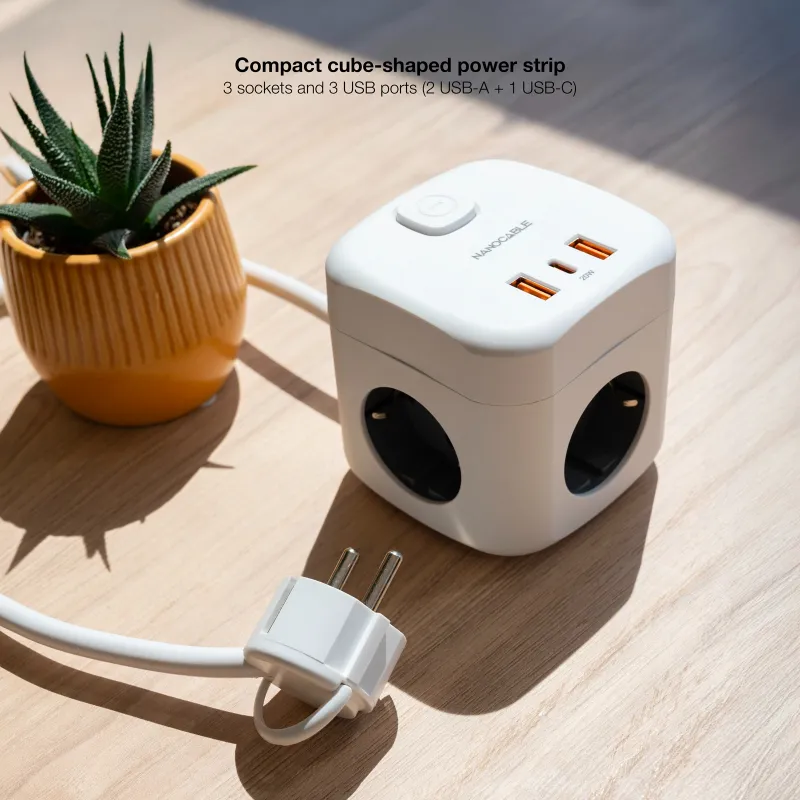 FORMATO CUBO, ORDEN MÁXIMO EN TU ESCRITORIO: La Nanocable 10.37.0011 concentra tres tomas de 16A y tres puertos USB en un diseño cúbico que libera espacio y evita marañas de cables. Como base de enchufes con USB pensada para escritorios y mesillas, sustituye múltiples cargadores por un único punto de conexión, con regleta con interruptor para cortar energía cuando no la necesitas. Su compatibilidad USB GaN PPS con PD 20W en USB-C agiliza la carga de móviles, auriculares y accesorios. Si buscas una regleta 3 tomas discreta y funcional, la Nanocable 10.37.0011 prioriza orden, seguridad y eficiencia sin sacrificar versatilidad.