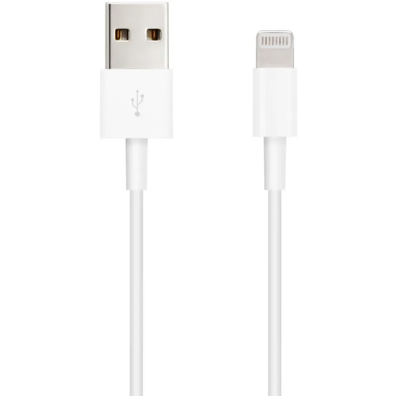 Cable Lightning con conector tipo Lightning macho en un extremo y conector USB A macho en el otro.