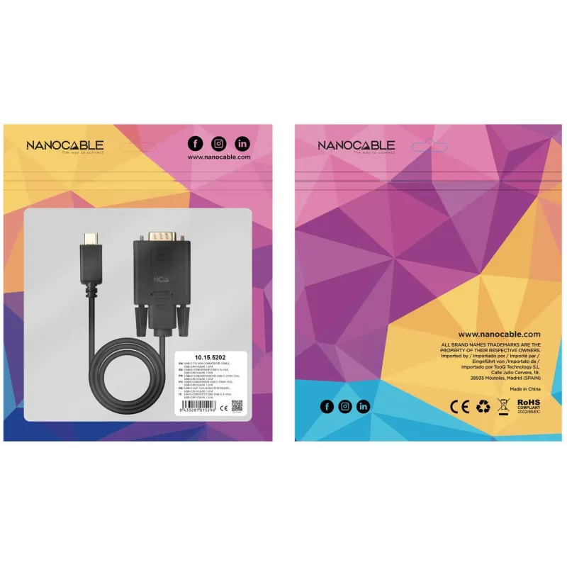 Adaptador Nanocable 10.15.5202 Conecta USB-C a VGA con resolución 1920x1200 60Hz Diseño Plug & Play 1.8m de cable Certificación CE y RoHS.