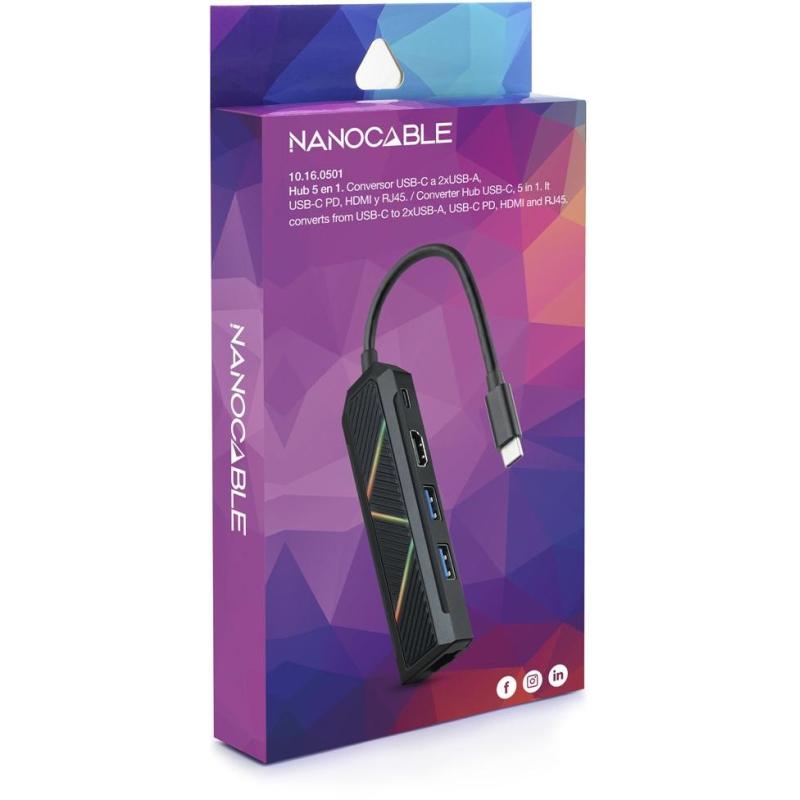 Nanocable 10.16.0501 HUB USB-C a USB-A/USB-C/HDMI/RJ-45 5 Puertos 15 cm Negro