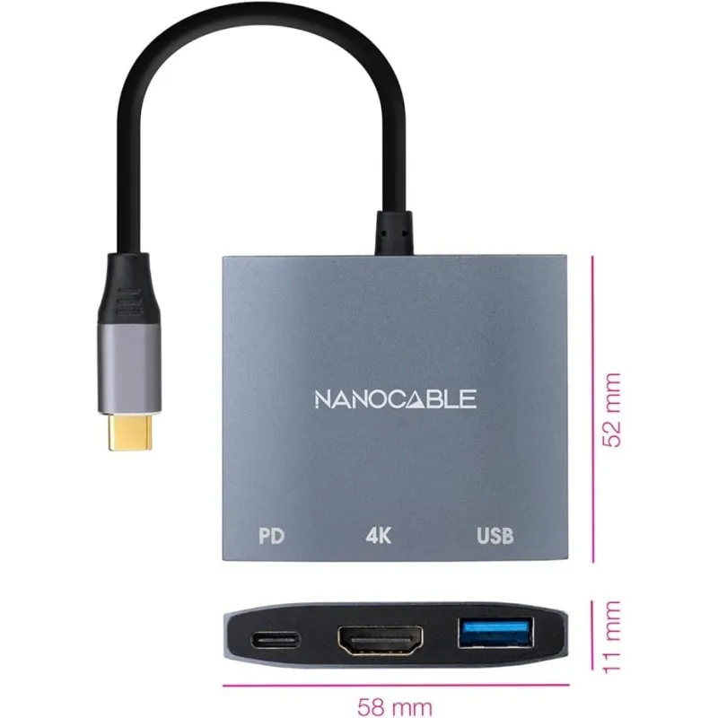 Nanocable 10.16.4306 Conversor USB-C a HDMI 4K/PD/USB 3.0 15cm Gris