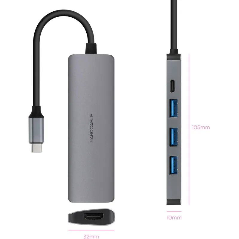 Nanocable 10.16.4605 Hub USB-C a 3xUSB-A/HDMI/USB-C PD Gris