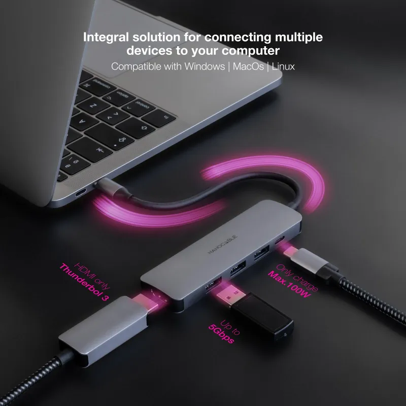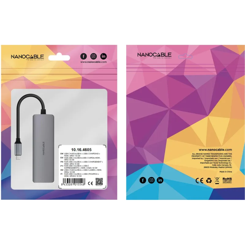 Este Hub USB Nanocable 10.16.4605 también incluye un puerto HDMI que admite una resolución 3840 x 2160 píxeles, ideal para quienes requieren calidad de imagen en pantallas externas. El dispositivo es compatible con sistemas operativos Windows, Mac, Linux y Android, lo que lo convierte en una opción flexible para distintos entornos de trabajo. Aunque no dispone de lector de tarjetas ni puerto Ethernet, su enfoque está claramente orientado a la expansión de puertos USB y salida de vídeo de alta definición. Su alimentación vía USB y cable de 0,18 metros integrado lo hacen especialmente práctico para usuarios móviles. Con un diseño compacto de 104 mm de ancho y 11 mm de altura, se adapta fácilmente a cualquier espacio de trabajo sin ocupar demasiado espacio.