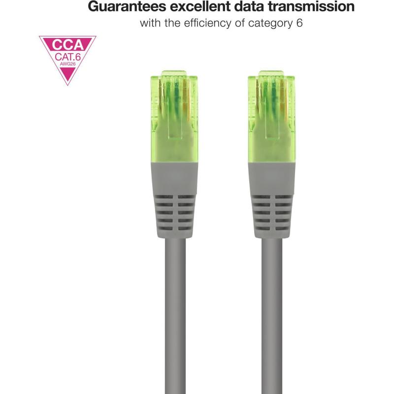 CABLE DE RED CAT.6 UTP AWG26 CCA: Cable de red CAT.6 UTP AWG26 CCA con conector tipo RJ45 en ambos extremos. CCA (Aluminio Recubierto de Cobre), consiste en un cable UTP con núcleo sólido de aluminio, revestido con una capa exterior de cobre de alta conductividad. Garantiza la misma conectividad que el cobre.