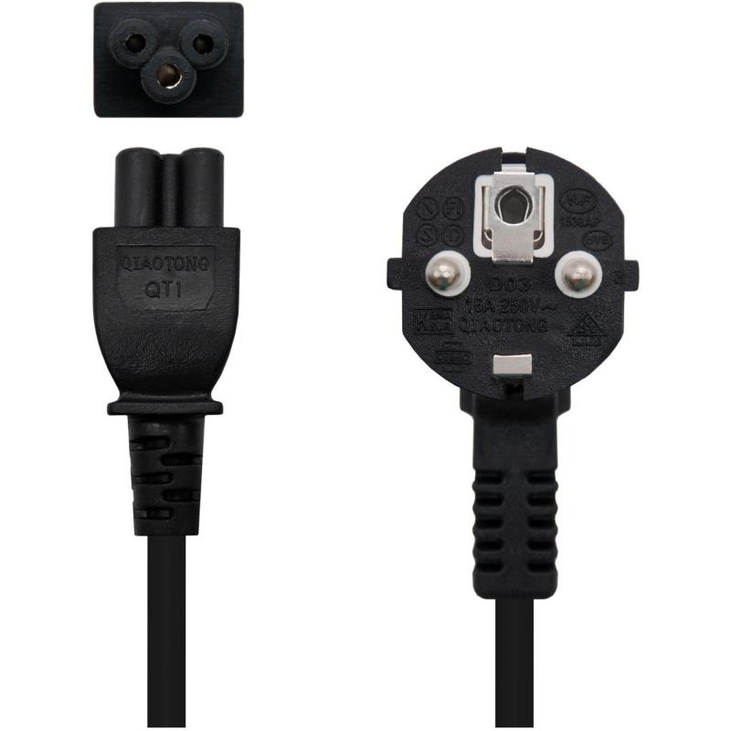 Este cable cuenta con un conector CEE7/7 en un extremo y un conector C5 acoplador en el otro, garantizando compatibilidad con una amplia variedad de equipos. Además, el conector CEE7/7 presenta un factor de forma angular, lo que facilita su conexión en espacios reducidos. Fabricado con material de conductor de cobre, este cable asegura una excelente conductividad y durabilidad, soportando una potencia máxima de 1500 W.