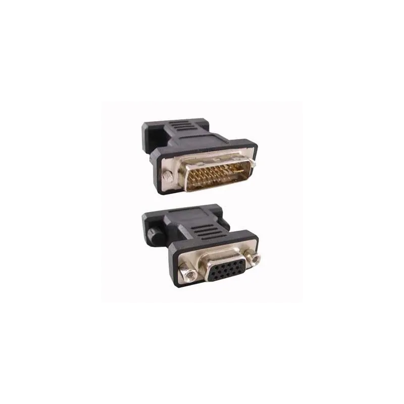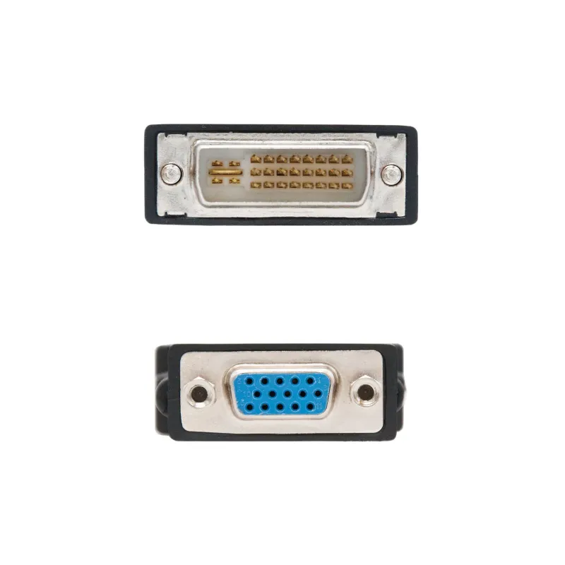 - Adaptador DVI a VGA con conector DVI tipo 24+5 macho en un extremo y VGA HDB15 hembra en el otro.