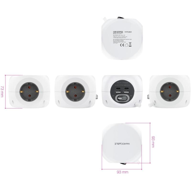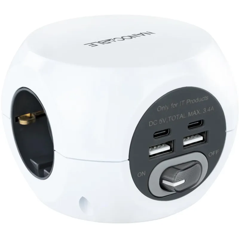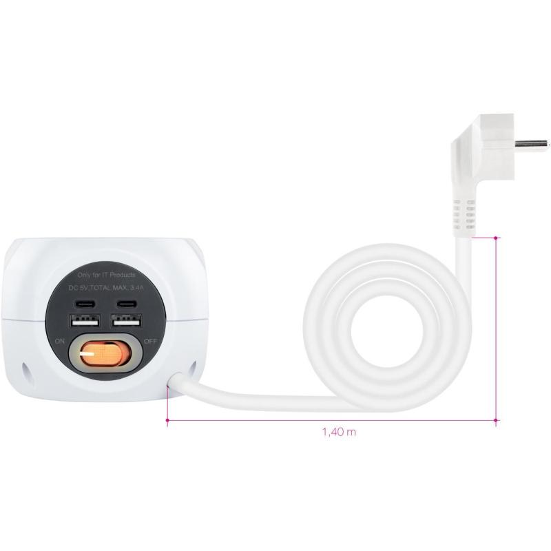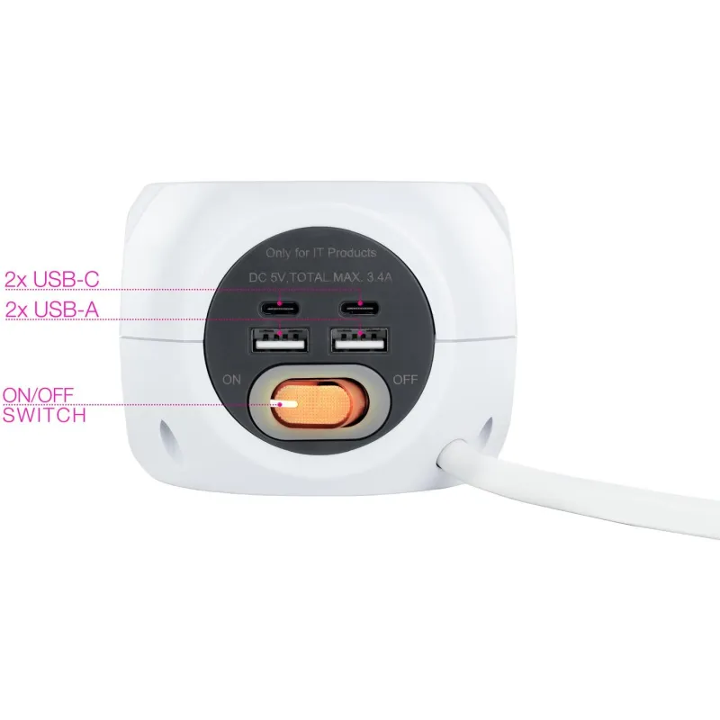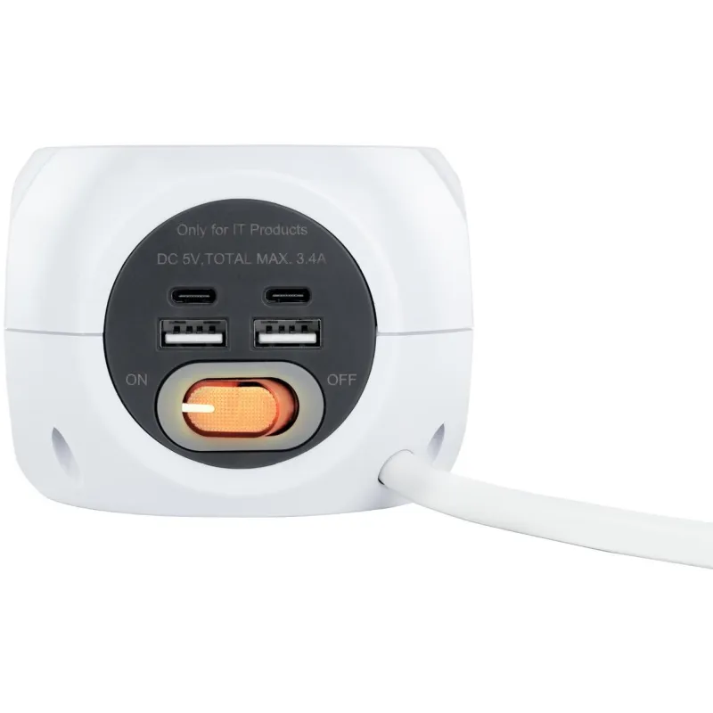 Base de 3 enchufes con 4 USB's (2 USB A + 2 USB-C), con interruptor