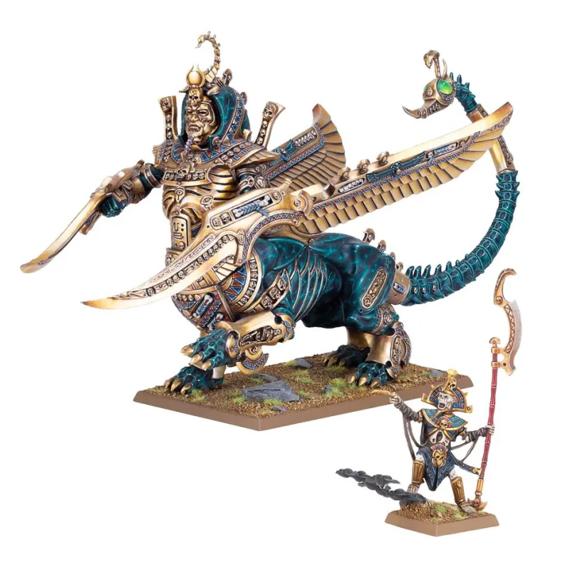Diferenciadores: diseño específico de Khemri con motivos faraónicos, silueta alada muy vertical que domina el campo de batalla, miniatura pensada como auténtico centro de atención en colecciones de no muertos.