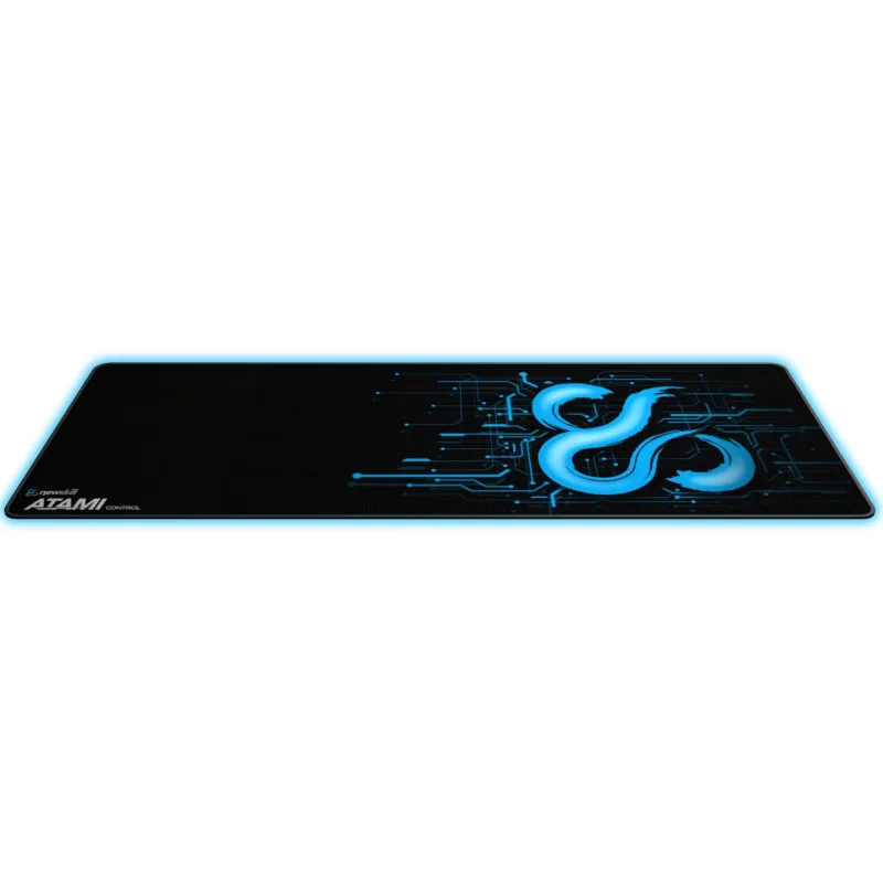 Alfombrilla Gaming Newskill Atami Control Tamaño XL profesional con material fibra y caucho, dimensiones 930 x 360 mm, color negro y azul estampado