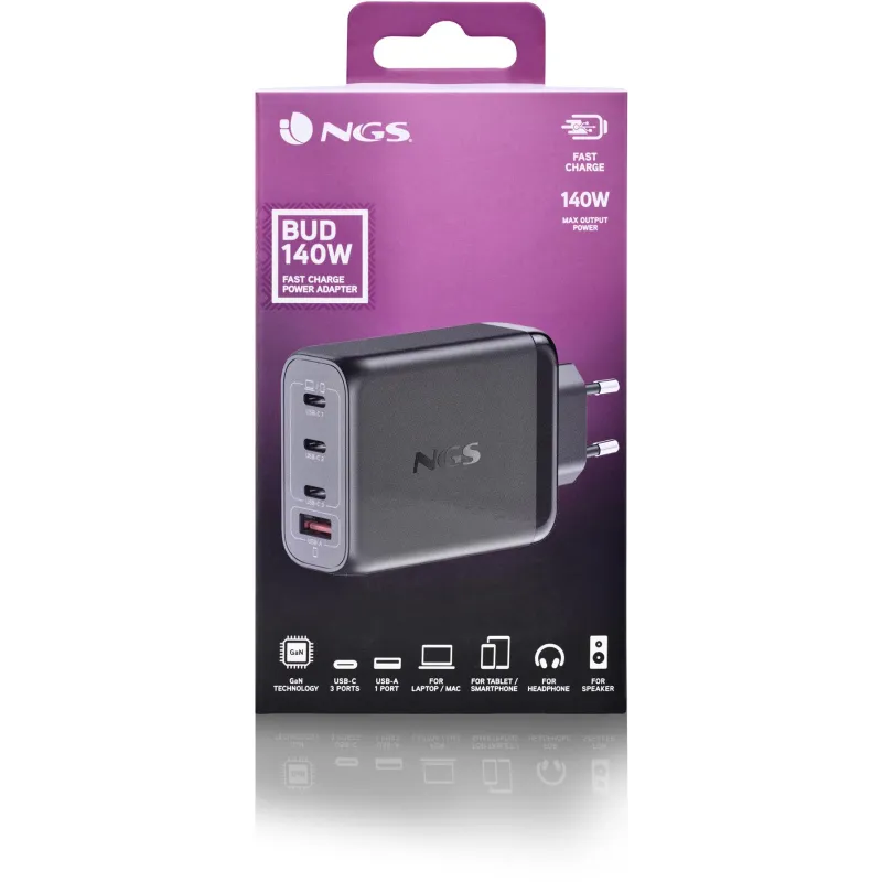 Cargador de Móvil NGS BUD140W con tecnología Quick Charge 3.0, potencia de salida 140 W y compatibilidad universal