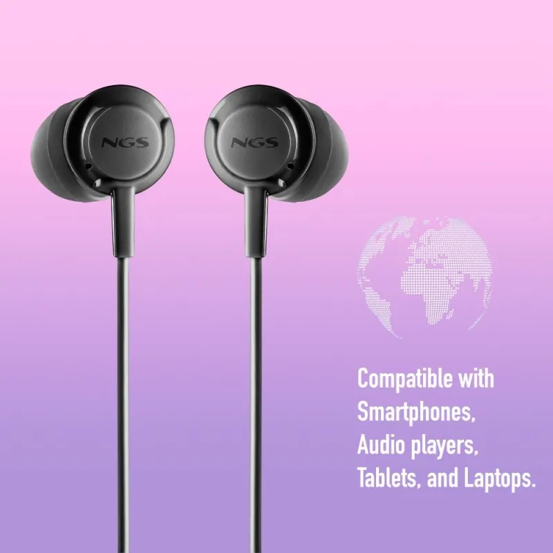 Auriculares NGS CROSS DRIFT BLACK con micrófono, jack 3,5 mm, botón multifunción, control de volumen y cable 1,2 m. Compatibles con smartphone y portátil.