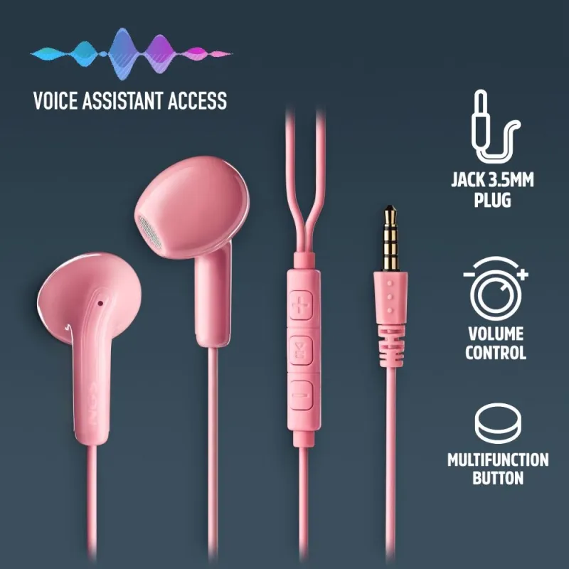 NGS CROSS FLIP: IN-EAR PRÁCTICOS CON ASISTENTE DE VOZ A TU ALCANCE: Los auriculares NGS Cross Flip Pink jack 3,5 mm combinan estética y funcionalidad para el día a día. La conexión analógica evita emparejamientos, el botón multifunción centraliza el control y el control de volumen en cable ajusta el nivel con precisión. En modo auriculares con manos libres, gestionas llamadas sin tocar el teléfono, y el asistente de voz auriculares responde a comandos comunes. El cable 1,2 m respalda movimientos naturales y el diseño in-ear mantiene el ajuste. Una propuesta sencilla y universal pensada para quienes prefieren la fiabilidad directa del conector de 3,5 mm.