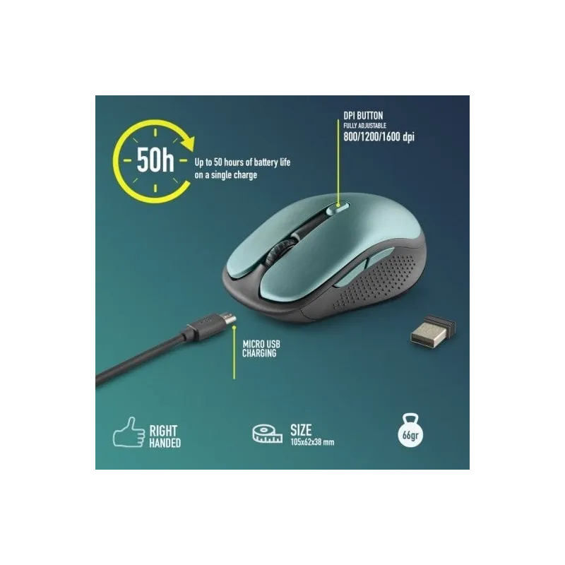 Con un práctico interruptor de encendido/apagado integrado y la función Plug and Play, este ratón es fácil de usar desde el primer momento. Funciona con una batería AA de 600 mAh, incluida en el paquete, lo que asegura una larga duración de uso. Su compacto tamaño (62 mm de ancho, 38 mm de profundidad y 105 mm de altura) y ligero peso de 66 g lo hacen portátil y fácil de transportar.