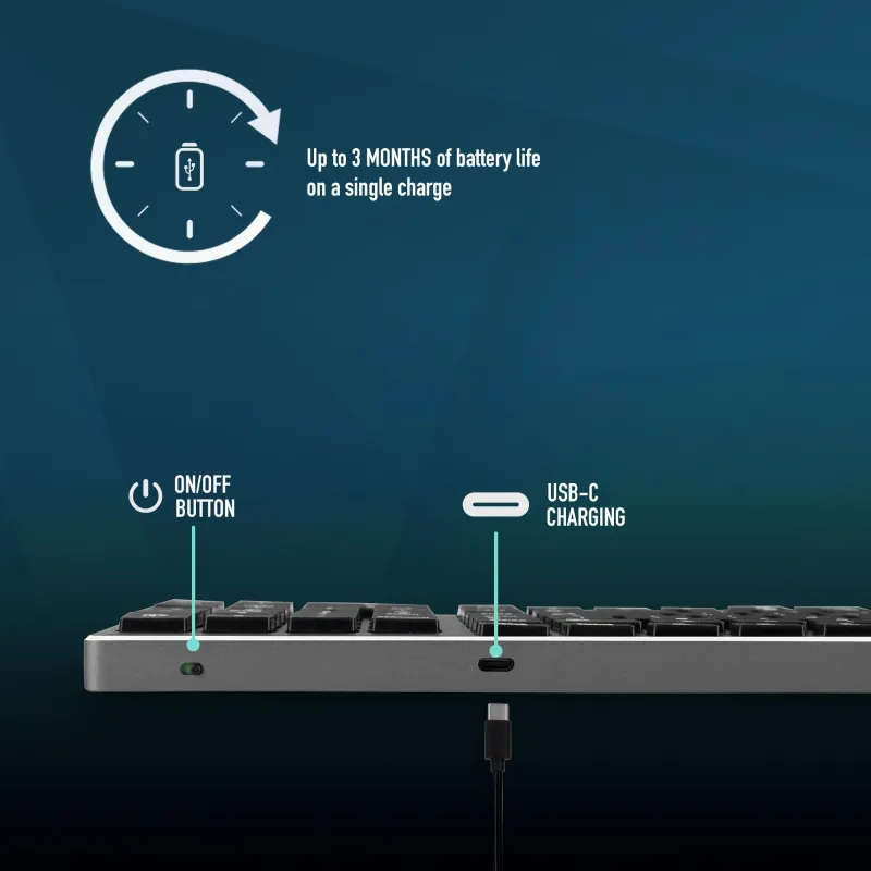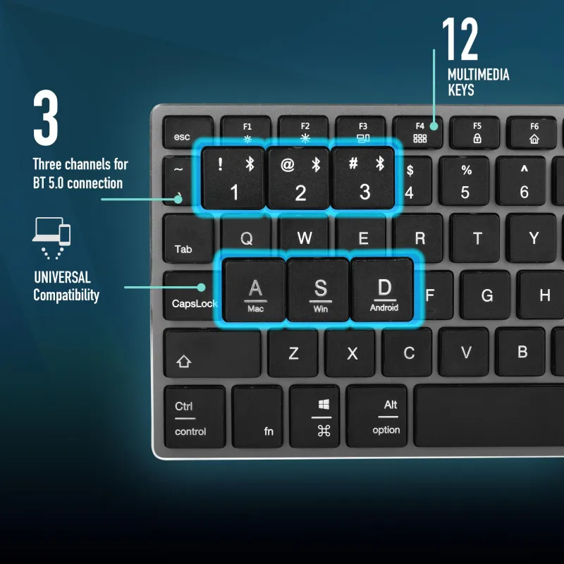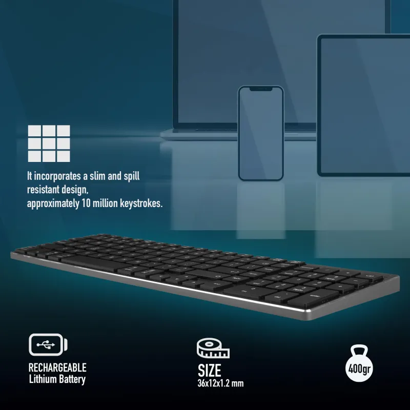 TECLADO MULTIMODO INALÁMBRICO FORTUNE-BT: Teclado inalámbrico multidispositivo recargable.