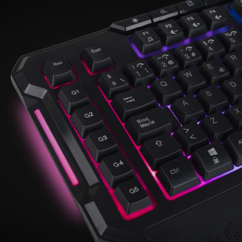 Membrana - Número de teclas: 104 - Diseño de teclado: QWERTY - Idioma del teclado: Español - Conectividad: Cable USB-A - Retroiluminación: Si - Longitud de cable: 1,8 m