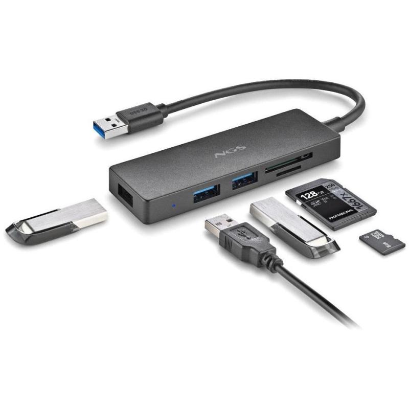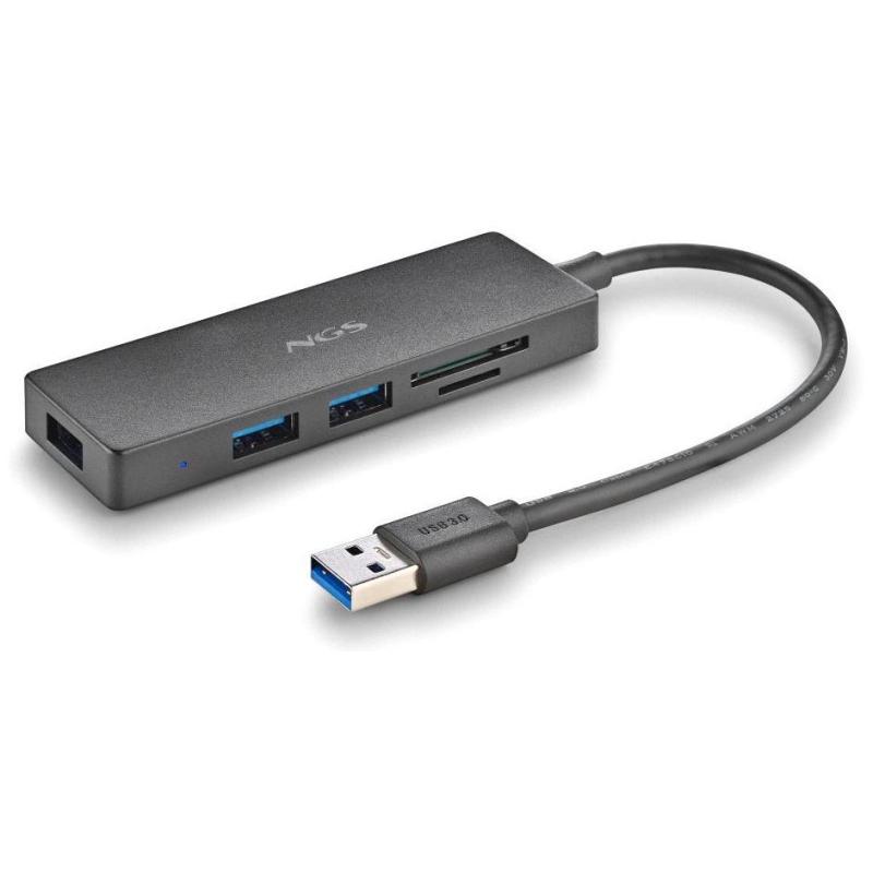 Hub USB NGS iHub Reader expande conectividad con 3 puertos USB 3.2 y lector de tarjetas velocidad de 5000 Mbit/s, color Negro