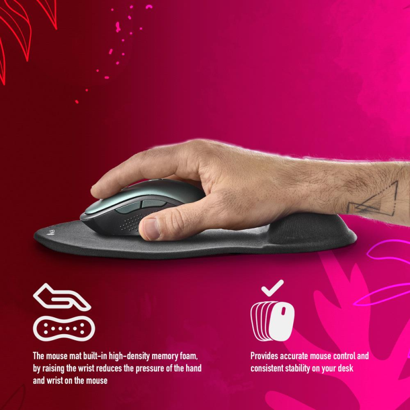 - Almohadilla de ratón ergonómica rellena de gel en la zona de apoyo de la muñeca para un máximo confort.