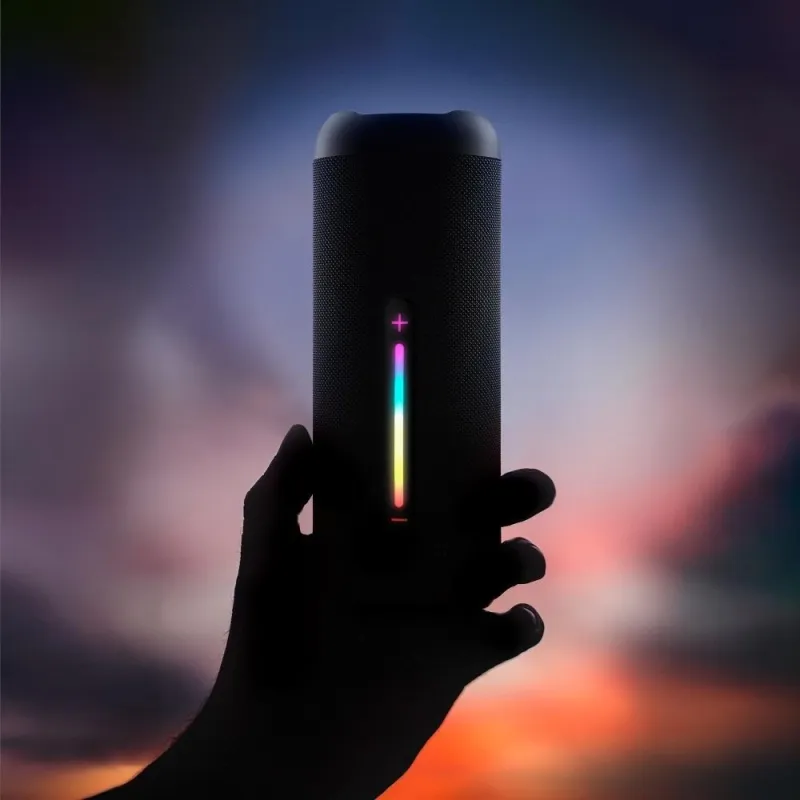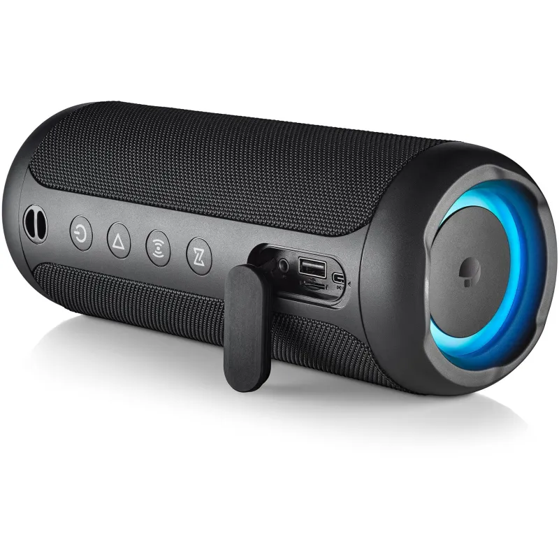 La iluminación LED multicolor agrega un toque de estilo, mientras que los botones de control de volumen y el interruptor de encendido/apagado integrado proporcionan facilidad de uso. Disfruta de hasta 9 horas de autonomía gracias a su batería de iones de litio de 2500 mAh. La carga es rápida y sencilla con el cargador incorporado.