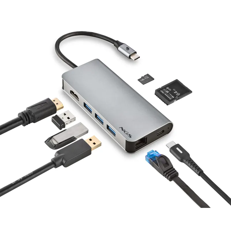 HUB NGS Wonder Dock 8 concentrador de 8 puertos USB-C a USB-a , HDMI . microSD , SD , RJ-45 y con una resolución máxima de 3840 x 2160 píxeles. 4K@30 Hz.