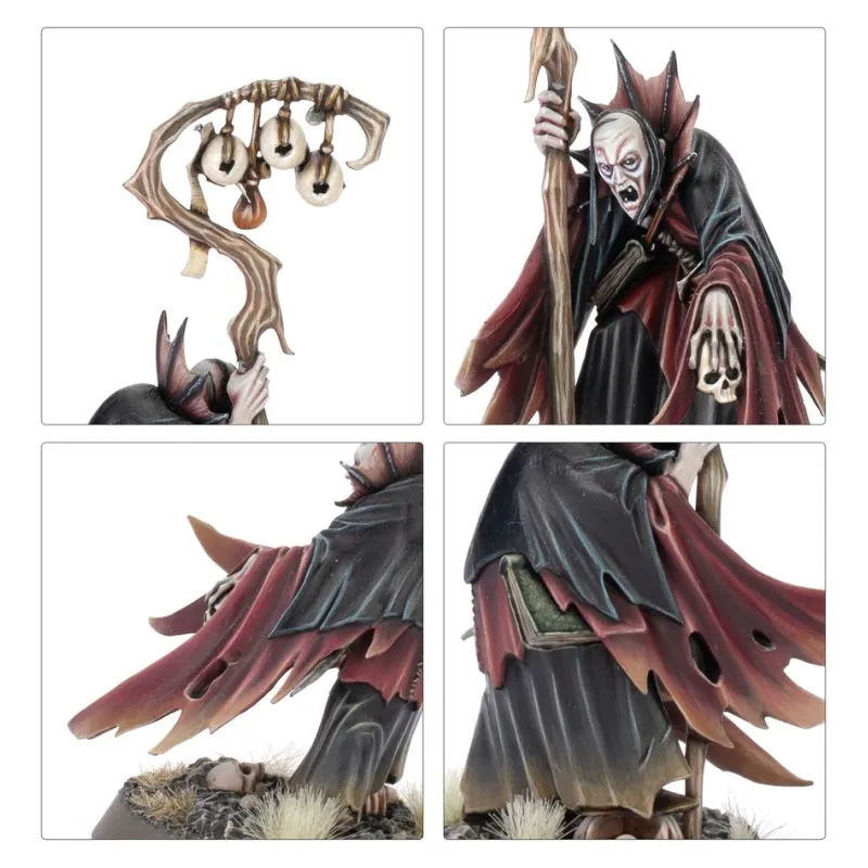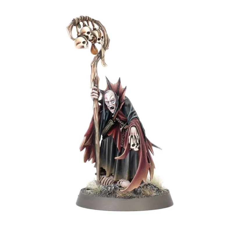 La estética del modelo responde al arquetipo de hechicero oscuro: capa amplia, báculo rematado en cráneo y expresión consumida por la magia. Esto facilita aprovecharlo tanto en Warhammer como en otros juegos de fantasía donde necesites un mago de la Muerte o un villano principal. En campañas de rol de fantasía puedes colocarlo como antagonista recurrente sin que desentone con otras gamas de miniaturas.