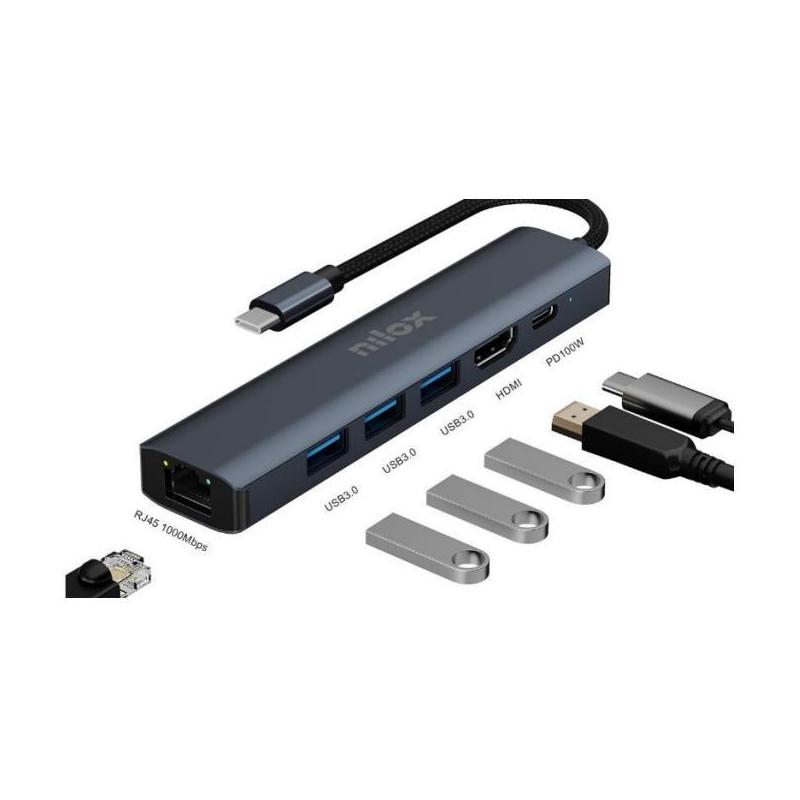 Nilox NXDSUSBC06 Docking Station 6 en 1 USB-C a USB-A/HDMI/RJ-45 Negro