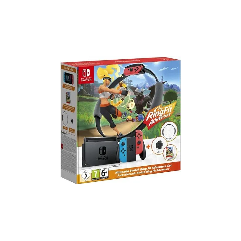 Nintendo Switch (con Joy-Con azul y rojo) y el juego Ring Fit Adventure juntos : Agarra el Ring-Con, ponte la cinta de la pierna y prepárate para vivir una aventura de fitness muy movida (¡literalmente!).