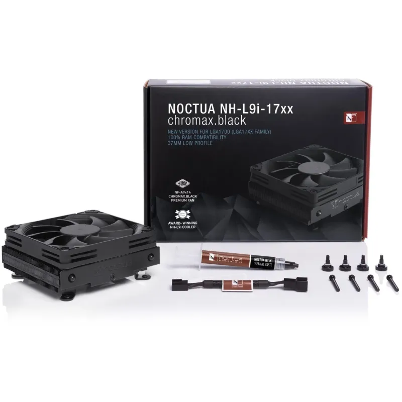 VERSIÓN TOTALMENTE NEGRA DEL NH-L9I-17XX: El NH-L9i-17xx chromax.black es una versión completamente negra del galardonado disipador de CPU silencioso y de perfil bajo NH-L9i-17xx de Noctua para HTPCs y construcciones de Factor de Forma Pequeño (SFF) basadas en Intel LGA1700 (familia LGA17xx). Gracias al mismo diseño de disipador probado y al ventilador NF-A9x14 PWM, se mantiene fiel a la exitosa fórmula del NH-L9i-17xx de fusionar una altura de solo 37 mm con un rendimiento fuerte y una excelente operación silenciosa, así como una compatibilidad del 100% con RAM y PCIe. Al mismo tiempo, la versión chromax.black con su ventilador negro y disipador recubierto de negro combina estos activos con un aspecto elegante y sigiloso. Coronado con el reconocido sistema de montaje de perfil bajo SecuFirm2 para Intel LGA1700 (familia LGA17xx), el compuesto térmico de grado entusiasta NT-H1 de Noctua y una garantía completa de 6 años del fabricante, el NH-L9i-17xx chromax.black es una opción premium para clientes que buscan un disipador ultra compacto que luzca tan bien como enfría.