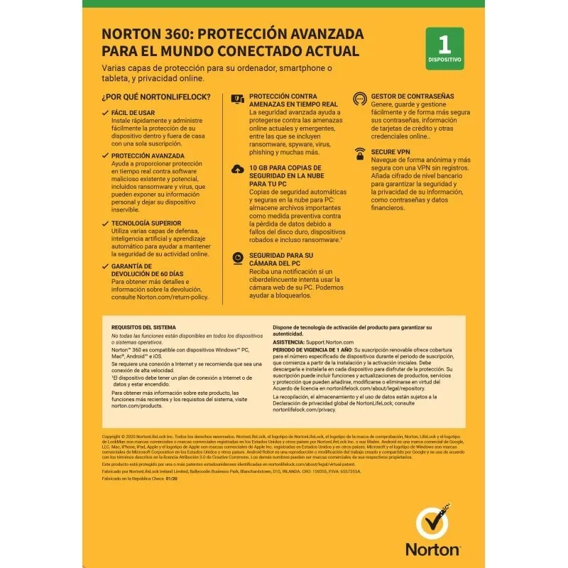 Norton 360 Estándar 10GB ES 1 Usuario 1 Dispositivo Licencia Electrónica (ESD)