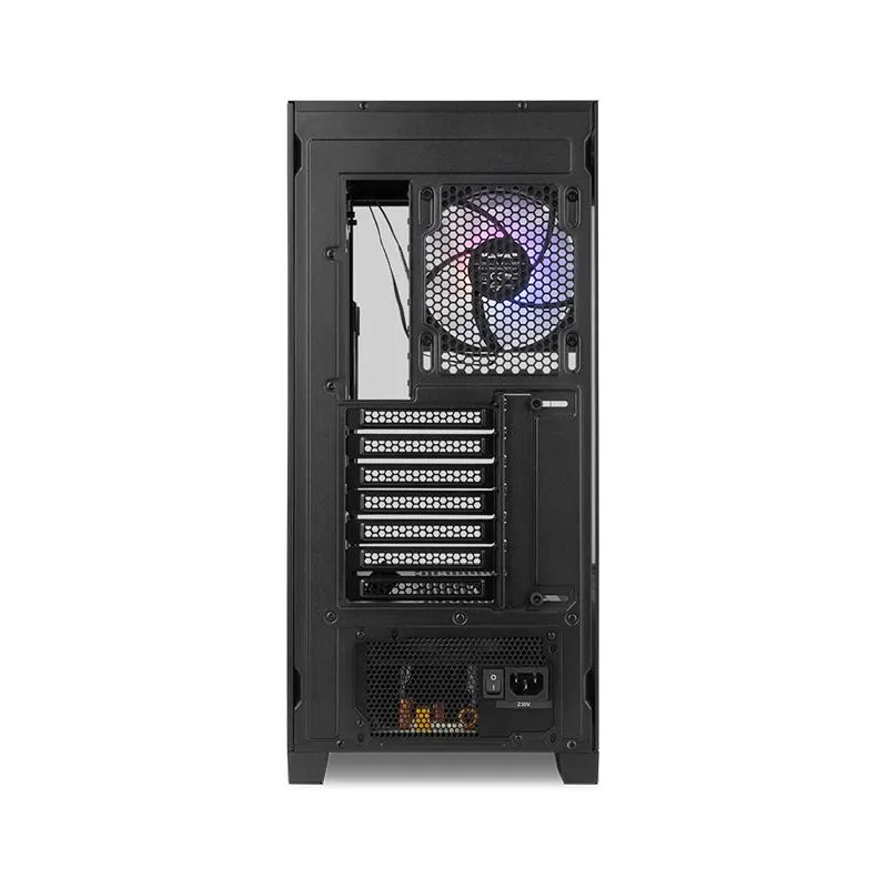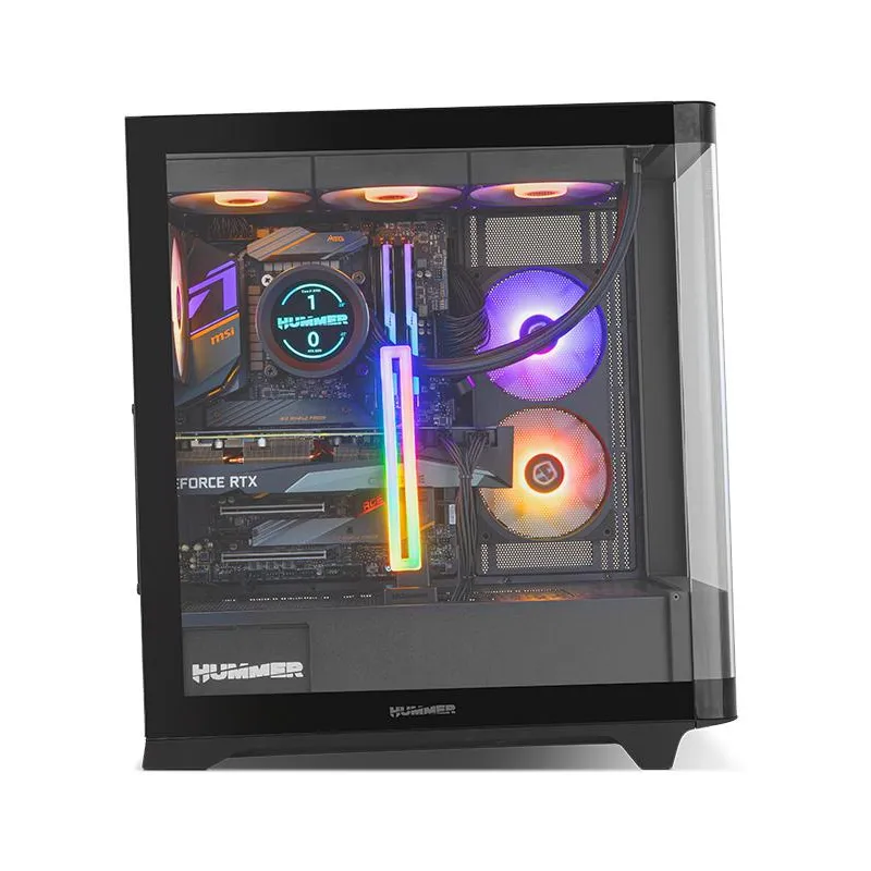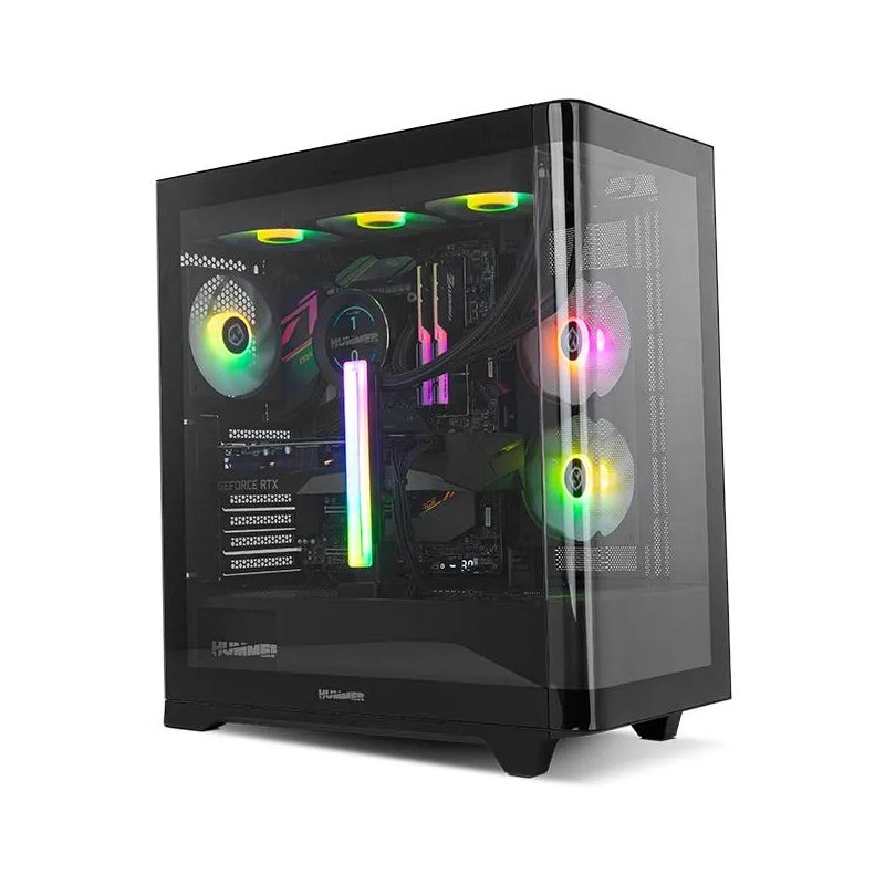 DISEÑO MODERNO CON VIDRIO TEMPLADO PARA UNA ESTÉTICA GAMING La Torre Nox Hummer ETHER Negro destaca por su diseño elegante y robusto, fabricada con materiales de alta calidad como el vidrio templado y acero SPCC. Este panel lateral transparente no solo mejora la estética del equipo, sino que también permite lucir los componentes internos con iluminación RGB. Su estructura tipo midi tower es compatible con placas base ATX, ITX y Mini-ATX, lo que la convierte en una opción versátil para configuraciones avanzadas. Además, cuenta con siete ranuras de expansión y múltiples bahías para discos duros de 2.5 y 3.5 pulgadas, ofreciendo una solución completa para usuarios exigentes. La Torre Nox Hummer ETHER Negro es ideal para quienes buscan una caja con diseño atractivo y funcionalidad avanzada, sin renunciar a una estructura sólida y moderna.