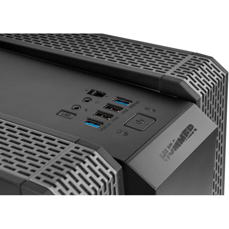 ACCESOS Y PANEL FRONTAL: El panel superior de Hummer Fusion cuenta con dos USB 2.0, dos USB 3.0 de alta velocidad, el controlador de velocidad de los ventiladores y las conexiones de audio.