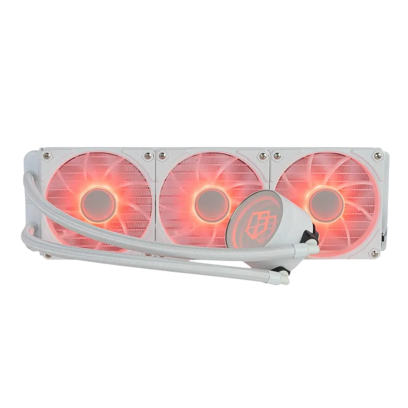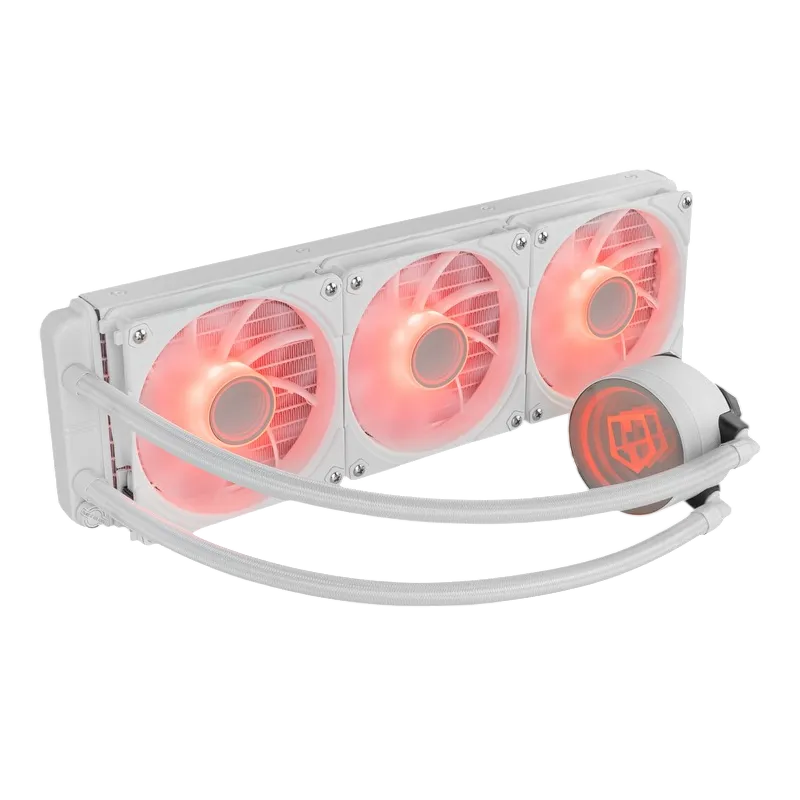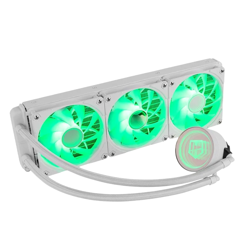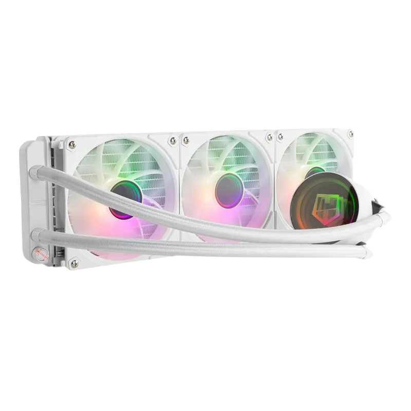 El conjunto combina radiador de aluminio y tres ventiladores de 120 mm PWM con ARGB. La idea es clara: buen margen térmico para sesiones largas y, a la vez, un montaje blanco que luce bien cuando el equipo queda a la vista.
