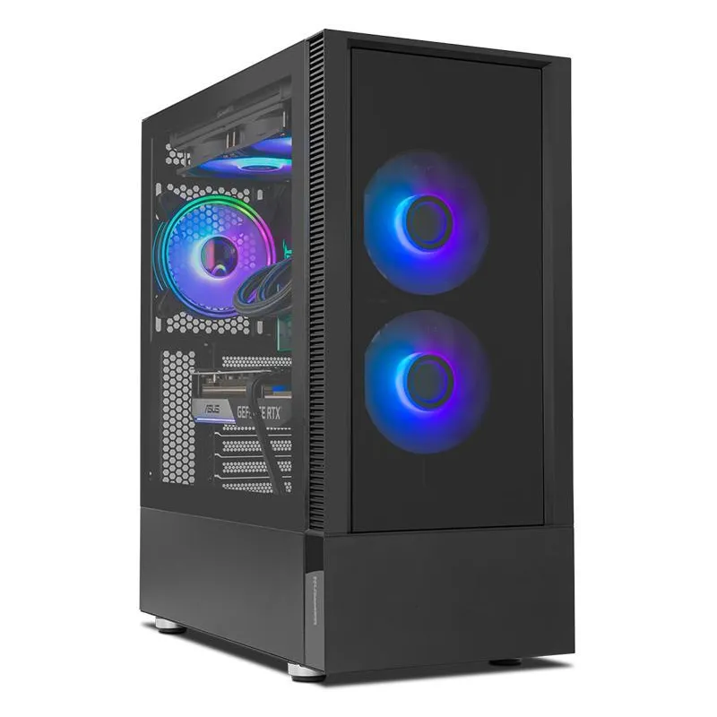 Este gabinete para PC presenta un diseño robusto fabricado en ABS, SPCC y acero, con un elegante acabado en color negro. Compatible con factores de forma ATX y micro ATX, ofrece versatilidad para diversas configuraciones. Cuenta con una ventana lateral y paneles de vidrio templado que permiten una vista clara del interior, complementado por una iluminación multicolor en los ventiladores.