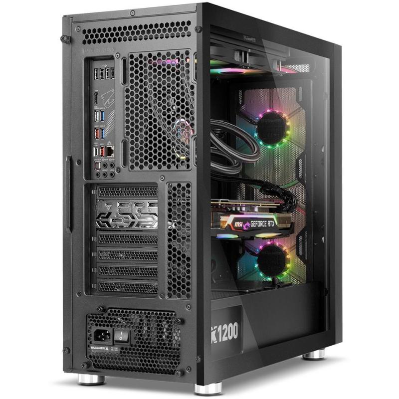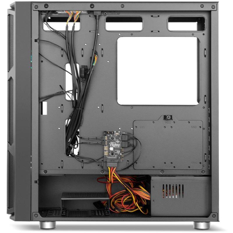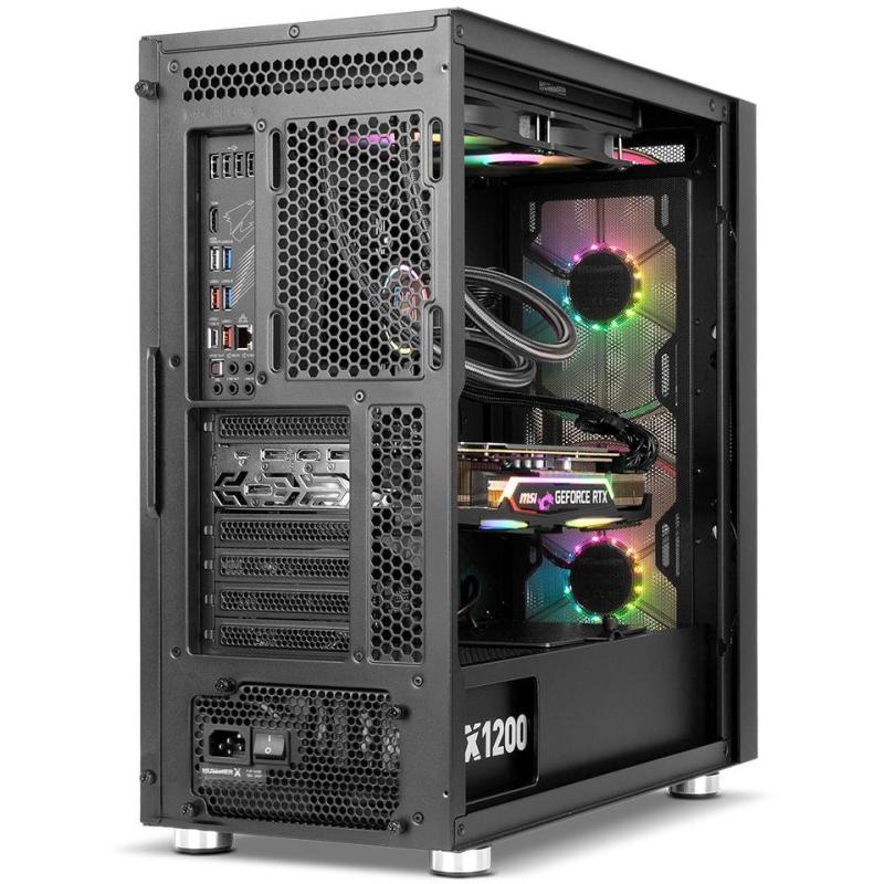 El diseño del chasis incluye una ventana lateral y paneles de vidrio templado que permiten admirar los componentes internos, mientras que la iluminación en los ventiladores de la caja añade un toque estético adicional. También dispone de un filtro anti-polvo y gestión de cables para mantener el interior limpio y ordenado.