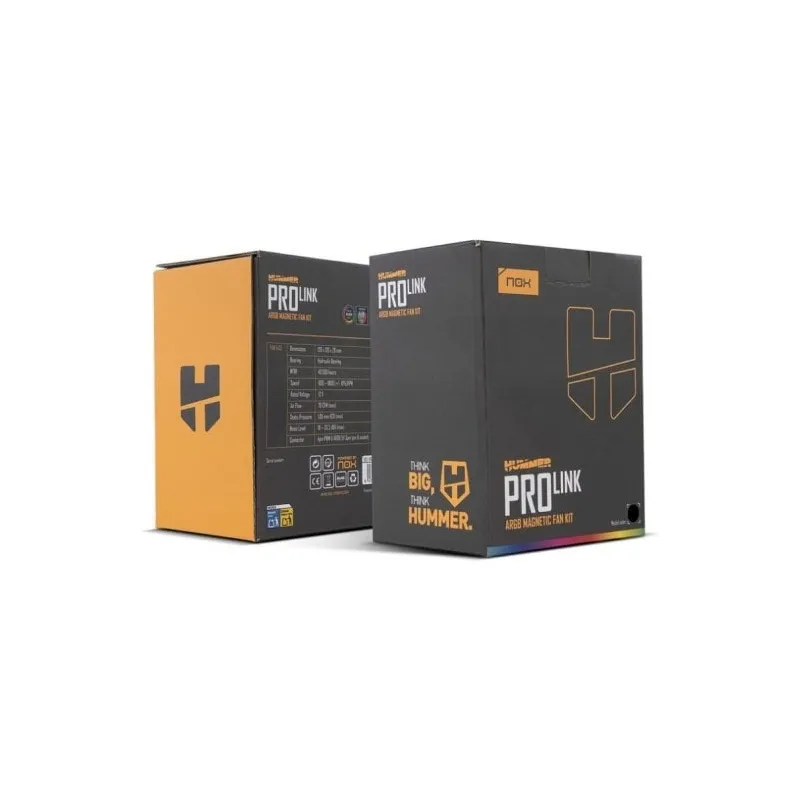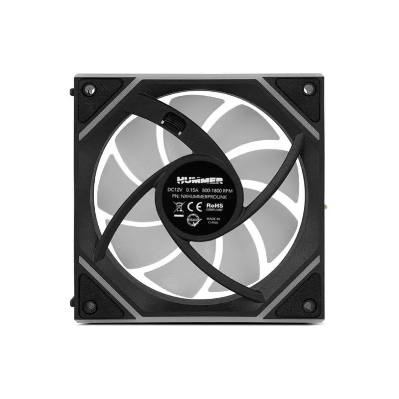 Pack de 3 ventiladores NOX Hummer PRO LINK ARGB Negro 120 mm con unión magnética PROLINK. PWM 600–1800 RPM y ARGB 5 V (3 pines) para un montaje más limpio.